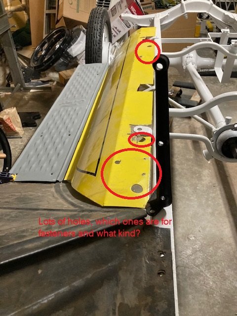2) I assume that the top of a skirt fastens to the Speedster body but with how many and what kind of fastener? Lots of holes of various sizes, what goes in them? See picture. Also some cutouts of unknown function from the previous owner.