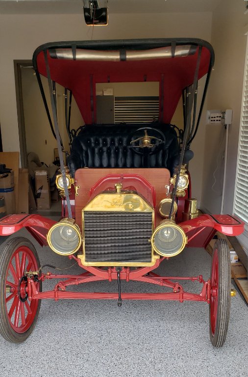 The LAST piece of my early Canadian '13 is now corrected out. FINALLY!!! The correct all brass Victor carbide generator. My car is basically a 1912 chassis with a 1913 body. John Brown model 19 lights and model 105 tail light, E&J cowl lights, and the Victor carbide generator. My 1912 running board has a very specific "3 hole" pattern with 6 5/16" distance between centers, that only ONE generator seemingly matches to. Three years of research including lengthy discussions with a couple of really hard core Ford experts, and leg work finally led me to which generator had this mounting hole pattern, and that is the very elusive Victor all brass model used from 1909-1912. One of the hardest, if not THE hardest one to find. The "Ford Times" of April 1913 shows a photo of a T with this generator on it. That's a really late date to sport last year's brass! My car was built in Sept. or Oct. 1912, and sold new in Nov. 1912 in Tavistock, Ontario, Canada. This car hasn’t travelled very far from where it was sold new, less than 20 miles from where we live. The only thing that is actually the 1913 model year is the radiator, windshield, and the body. Everything else is all 1912. “B” series engine, number 872. I have all the documentation of the car since new. My grandfather bought it off of the original owner in 1956. B&W photo is from 1929: original owner's daughter's wedding. Lot's of original details! Note the wrong later engine pan, and the lack of the locating dimple castings on the front top iron which I've corrected. This picture proves that at least in 1929, this car had a mis-match of lights. I'm pretty sure it's been like this all it's life. Why would anyone replace two cowl lights with two other all brass ones when the car was only 16 years old. No one would have cared then what brand or they looked like. Since it's a pre assembly line car, I think Ford used up all their old parts and my car was one of those.