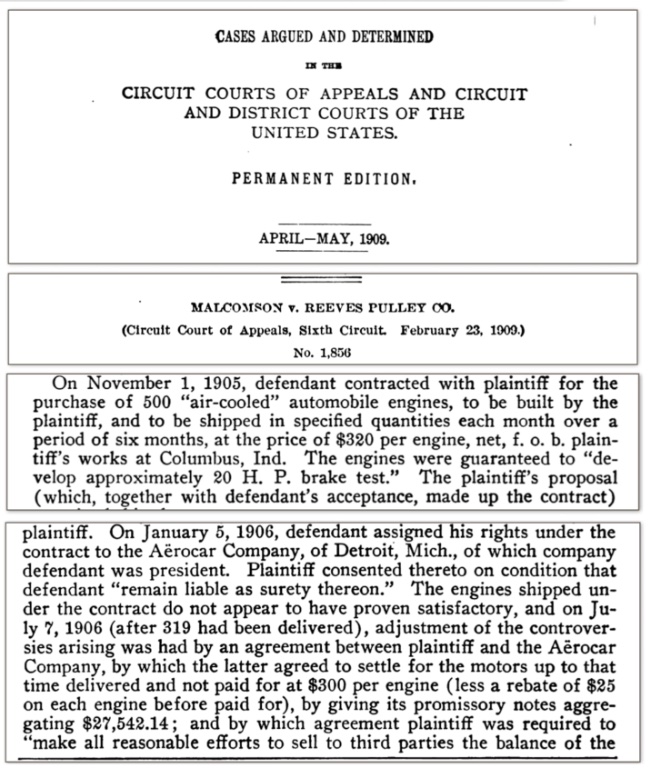 While no one at Ford Motor Company was aware of it, A.Y. Malcomson was a busy man in the fall of 1905. As FMC worked through initial production issues, advertising and developing their next models, K and N, Malcomson was also busy. However, it wasn't FMC that commanded his attention. Below, we see he secretly agreed to purchase 500 twenty horsepower air cooled motors from Reeves Pulley and Manufacturing Co. The document is a 1909 district court appeal, and gives us insight to what transpired in late 1905 and early 1906 between Ford and Malcomson.