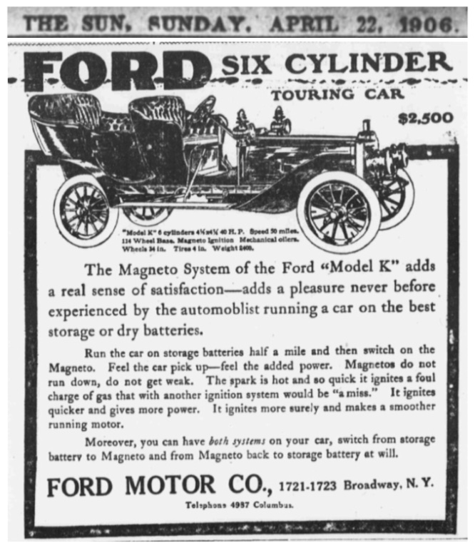This advertising appeared in the April 22, 1906 New York Sun newspaper. Both Ford and Aerocar advertised their new models for 1906. The first Model K were delivered in April, and by June deliveries rose to 100 in a month. I don't know what Aerocar's early production/deliveries were, but we do no Aerocar only took a little over 300 of the Reeves air-cooled motors between 1906 and 1908. Aerocar added a larger 40 hp water-cooled touring car and roadster to the 1907 and 1908 model line.