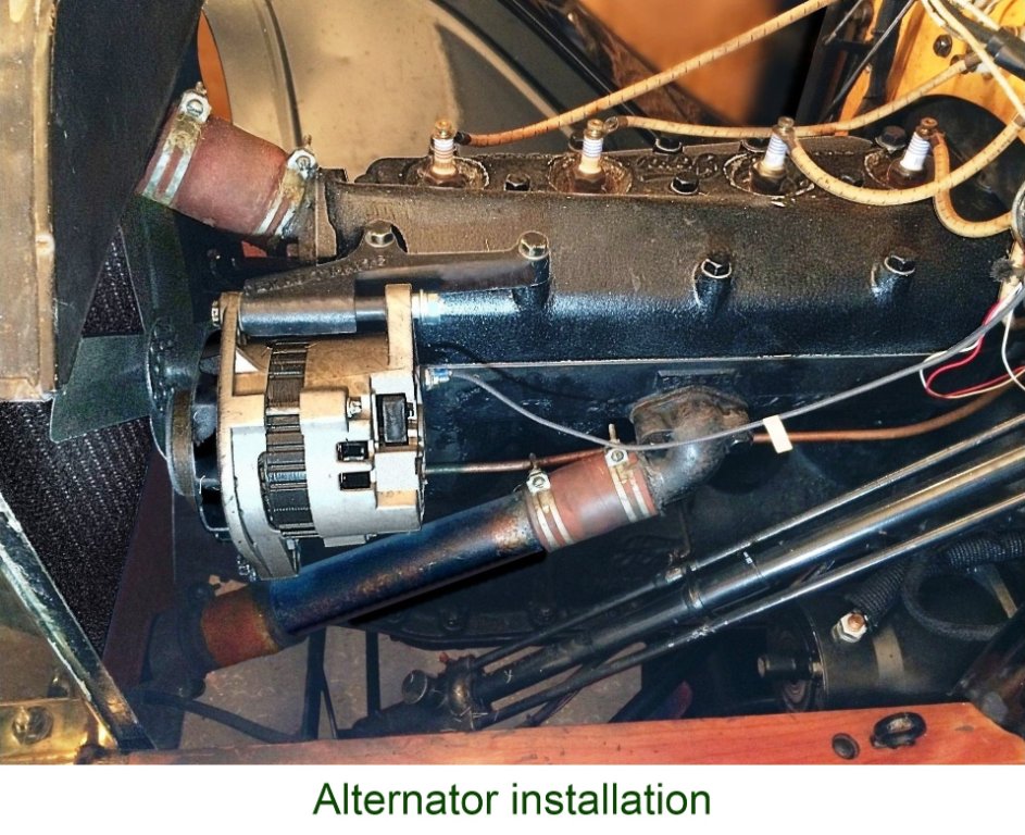 Well, now we had to decide to decide between a 6-volt system more in keeping with the vintage of the car, or figure that trying to historically justify putting ANY kind of self-sustaining electrical system in a Brass Model T was hopeless and just go with a modern 12-volt system (Again; in for a penny, in for a pound). We went with a bolt-on, belt-driven, 12-volt alternator and an Optima gel-battery mounted with the standard, Ford-type battery bracket intended for later-vintage Flivvers, beneath the rear floorboards. The alternator kit came with a very beefy bracket which mounts, with bank vault security, to the engine's head. While the alternator does a fair job of maintaining the battery, the car does sit idle in the garage for extended periods, particularly during winter, so now and then, I'll pull out the rear mat, lift up the floorboards and hook up a charger.