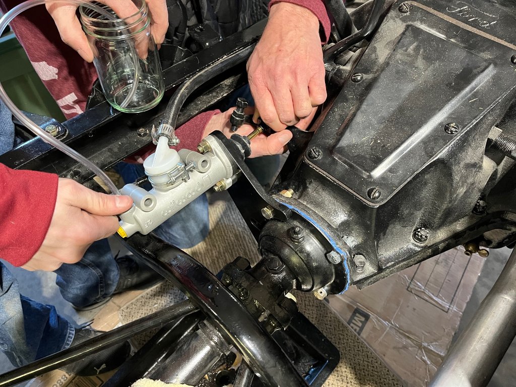 Bleeding the "SURE-STOP' disc brakes by Birdhaven. The first three photos are of bench bleeding the master cylinder and the fourth is bleeding the calipers.