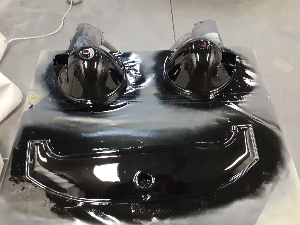 Splash panels painted and restored items in storage shed waiting for body to be painted.