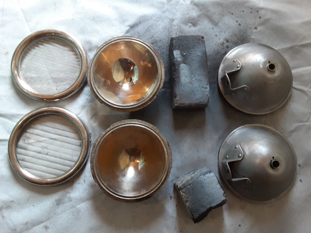 Head lamps and radiator apron restoration. Back side of apron primed.
