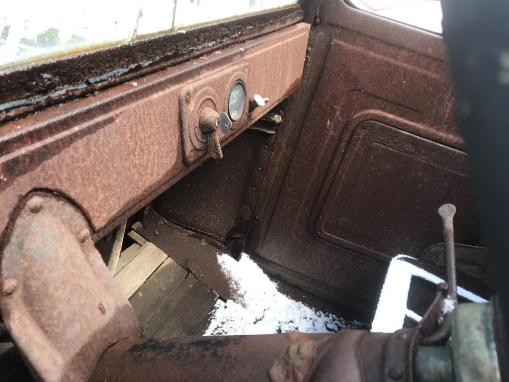 Dwight, Now that you have your truck home check for a frame number stamped on top of the passenger side frame rail near the hand brake cross shaft. If none then check the drivers side rail at hand brake. Like the cars, Ford started stamping the original engine number in December 1925, of Ford's fiscal year 1926, but not all factories did this. Another thing to check is that in March 1925 Ford stopped drilling the frame side rails for the cross bolt to mount the engine at the pan ears. The 20 inch rear TT truck wheels were available in 1925 and early to mid 1926 trucks used the 1925 type key switch like yours has. The floor board spacing for the pedals looks like the truck once had 1926 type pedals, now they are the pre 1926 type for the earlier motor. Trucks made in late 1925 would have used a 1926 type motor. Lacking a frame number, and for general information only, and not for the DMV if your title says diffrent, I would call the truck a 1925.