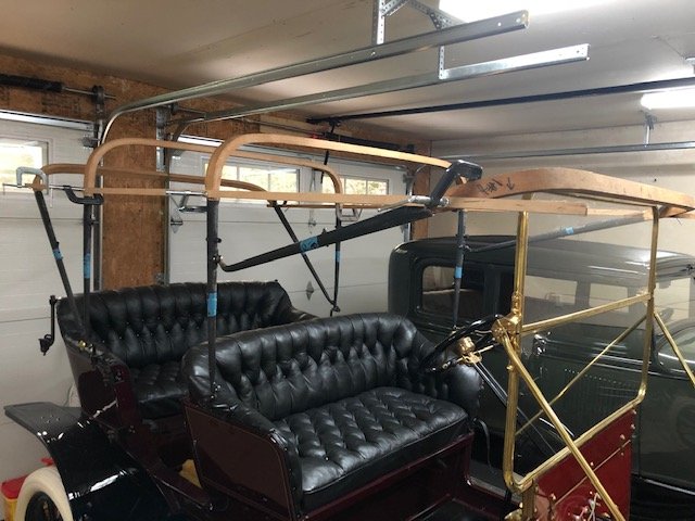I used that diagram for my top bow height dimensions. There is a good article by Royce on The Model T Fix about replacing the top. I duct taped and wired my wooden bows alongside the metal bow sockets at those correct heights and stood them all in place on the car to check and recheck the heights. I made a mark on each wooden bow at the top of each socket so I could know where to start my tapered shaping to fit inside the socket. The ends of the bows can be shaped (tapered) with a draw knife or I just used a angle grinder. If you Google 1911 Model T top bow dimensions there is a great article with pictures of this by Gary London in a 2005 MTFCA forum. This part of the top installation is most important and took a lot of time. Once the bows are shaped and in the sockets they can be stood and held in place with wooden straps clamped on each side to check the heights and the rront and rear bow overhang. The rear bow should be set so that the rear edge of the bow is overhanging the back of the body by about 2.5 niches. That way when the rear curtain is tacked to the body and on the bow it kinda follows the angle of the rear of the body. The front bow needs to be approx 2 inches in front of the windshield approx even with the bottom of the top brass windshield frame. The next step is to Take it all down and wrap the bows with the bow wrap. Once the bows are wrapped temporarly stand all the bows back in place to double check all your measurements and observe the overall look. After that you can install the bow webbing front to rear, or in an X pattern between the bows to hold it all in place. My top kit came with webbing to run front to rear but I wanted to do the X pattern so Mike at Classtique made some webbing to do that. All this will take a considerable amount of time and patience. With the bows in place and held by the webbing you can install the front windshield flap if you are using one, and the rear curtain. The rear curtain will need hung from the rear bow, make a mark at the center of the bow and the center rear of the body and the center of the top and bottom of the curtain and match them up to each other. The rear curtain then needs to be marked at the bottom to match up to where the Murphy fasteners are on the body. The fastener eyelets have to be installed in the bottom of the rear curtain at those locations by using a razor blade or with a leather punch made for that purpose. I used the punch. Next I hung the rear side curtains and marked the bottoms for the Murphy fasteners. The side panels get tacked to the bow first because the rear center curtain rolls up . The rear side curtains and top panel can be stretched and tacked to the rear bow. After the rear curtains are attached to the bow and the body you install the padding front to rear so that it covers the curved section of the bows. The next step is to install the top deck. Mark the center of the front and rear bow and the center of the top deck material in order to line the deck up correctly. Lay the top deck in place and tack at the center of the rear bow at the rear edge of the bow so the finish welting covers the tacks then go the front bow pull it tight and tack the center of the front bow. From there you can start pulling the top tight and tacking it from the center out toward each side. I would start at the rear bow then go to the front bow. Remember to tack the top deck on the front side of the front bow at the lower edge so that the finish welting covers the tacks. I would get the bows finished and wait for a hot sunny day to install the rest. Do not trim anything, you can do that once you are happy with how it looks. The front sides of the top deck has to be left long so it can be wrapped around for a finished look. This is an outline of how I did my 11 top. You can email or pm me and I will send you some pictures and my phone number to answer any questions. Art