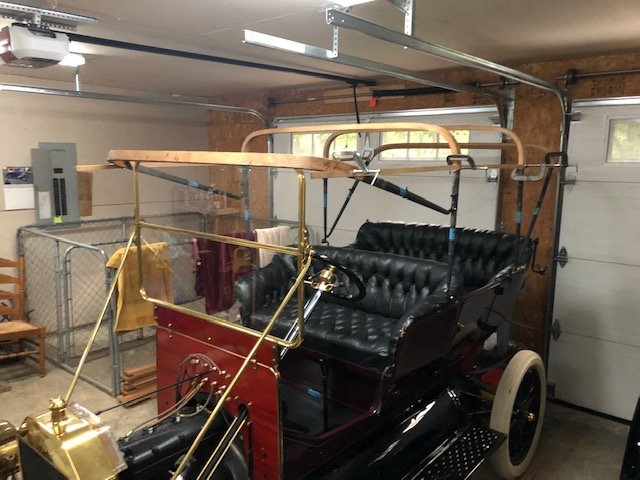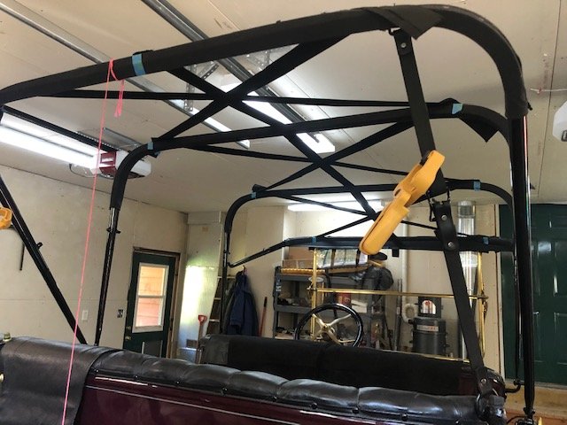 I used that diagram for my top bow height dimensions. There is a good article by Royce on The Model T Fix about replacing the top. I duct taped and wired my wooden bows alongside the metal bow sockets at those correct heights and stood them all in place on the car to check and recheck the heights. I made a mark on each wooden bow at the top of each socket so I could know where to start my tapered shaping to fit inside the socket. The ends of the bows can be shaped (tapered) with a draw knife or I just used a angle grinder. If you Google 1911 Model T top bow dimensions there is a great article with pictures of this by Gary London in a 2005 MTFCA forum. This part of the top installation is most important and took a lot of time. Once the bows are shaped and in the sockets they can be stood and held in place with wooden straps clamped on each side to check the heights and the rront and rear bow overhang. The rear bow should be set so that the rear edge of the bow is overhanging the back of the body by about 2.5 niches. That way when the rear curtain is tacked to the body and on the bow it kinda follows the angle of the rear of the body. The front bow needs to be approx 2 inches in front of the windshield approx even with the bottom of the top brass windshield frame. The next step is to Take it all down and wrap the bows with the bow wrap. Once the bows are wrapped temporarly stand all the bows back in place to double check all your measurements and observe the overall look. After that you can install the bow webbing front to rear, or in an X pattern between the bows to hold it all in place. My top kit came with webbing to run front to rear but I wanted to do the X pattern so Mike at Classtique made some webbing to do that. All this will take a considerable amount of time and patience. With the bows in place and held by the webbing you can install the front windshield flap if you are using one, and the rear curtain. The rear curtain will need hung from the rear bow, make a mark at the center of the bow and the center rear of the body and the center of the top and bottom of the curtain and match them up to each other. The rear curtain then needs to be marked at the bottom to match up to where the Murphy fasteners are on the body. The fastener eyelets have to be installed in the bottom of the rear curtain at those locations by using a razor blade or with a leather punch made for that purpose. I used the punch. Next I hung the rear side curtains and marked the bottoms for the Murphy fasteners. The side panels get tacked to the bow first because the rear center curtain rolls up . The rear side curtains and top panel can be stretched and tacked to the rear bow. After the rear curtains are attached to the bow and the body you install the padding front to rear so that it covers the curved section of the bows. The next step is to install the top deck. Mark the center of the front and rear bow and the center of the top deck material in order to line the deck up correctly. Lay the top deck in place and tack at the center of the rear bow at the rear edge of the bow so the finish welting covers the tacks then go the front bow pull it tight and tack the center of the front bow. From there you can start pulling the top tight and tacking it from the center out toward each side. I would start at the rear bow then go to the front bow. Remember to tack the top deck on the front side of the front bow at the lower edge so that the finish welting covers the tacks. I would get the bows finished and wait for a hot sunny day to install the rest. Do not trim anything, you can do that once you are happy with how it looks. The front sides of the top deck has to be left long so it can be wrapped around for a finished look. This is an outline of how I did my 11 top. You can email or pm me and I will send you some pictures and my phone number to answer any questions. Art