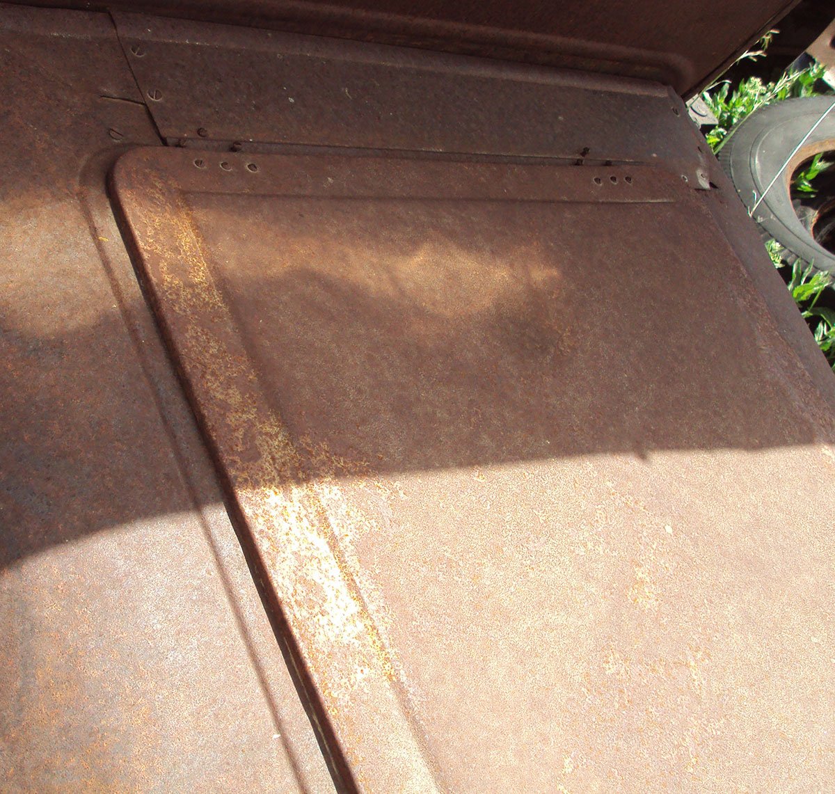 This turtle deck lid I made for a deck that was torn and flattened. It was for my first "Rusty" build and didn't have to be perfect. I bent the edge around a piece of particleboard. It took the outside some time to match the rest of the car but the inside has only rusted as shown in 20 some years and sitting outdoors. (Idaho) The handle was a flattened bolt shank and still has some zinc on it. What reminded me of this was remembering a ruined, rusty splash apron I sacrificed to make the missing piece in the deck. It is shown at top of the first photo with a new bead rolled into it. Then it was simply screwed into place.
