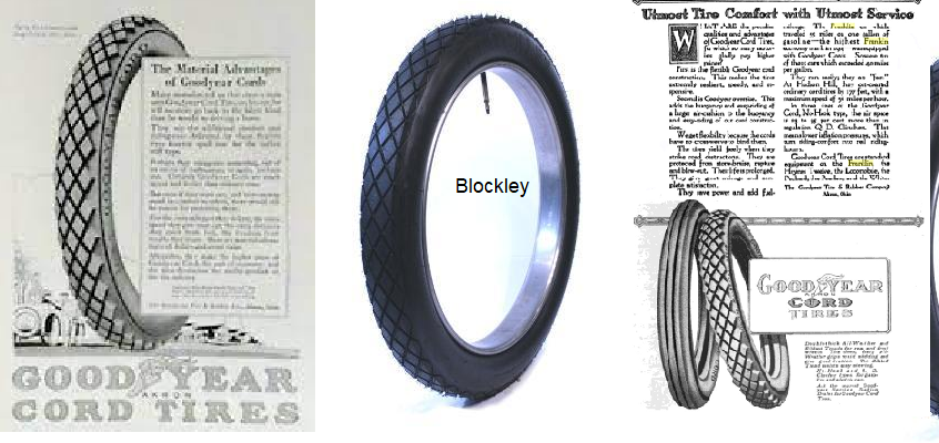 Most of the old ads for Goodyear Cord Tires online are hopelessly tiny, but this one from 1922 isn't bad. Not exactly the same tread as Blockley, but pretty close.