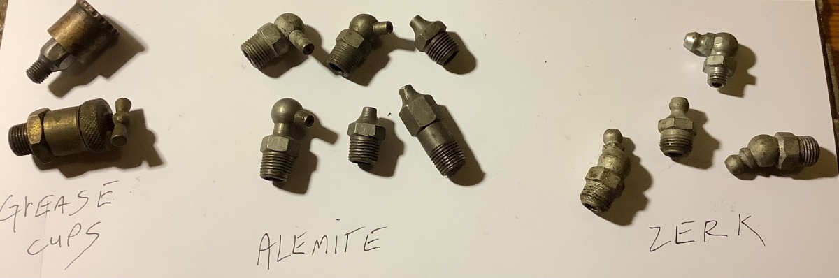 I went online a bit to refresh my memory, which is always good. What I’ve always called Pin Alemite, are pretty much referred to as Alemite fittings. These were indeed what model A Fords used for grease fittings, among other autos. Larger cars and equipment used Pin Alemite fittings which have the two pins on the side. Really high end cars used the pin Alemite grease fitt8ngs that even had little plated removable covers. I sold all of those awhile back, so no picture. Zerk fittings are on the right. Alemite and Zerk were two different inventions, and great automotive history to read. They both have specific grease guns, and another gun for the Pin Alemite. I can’t think of either of these used anywhere on model T originally. These were all better and a big improvement over the old grease cups, sometimes called “dope” cups.