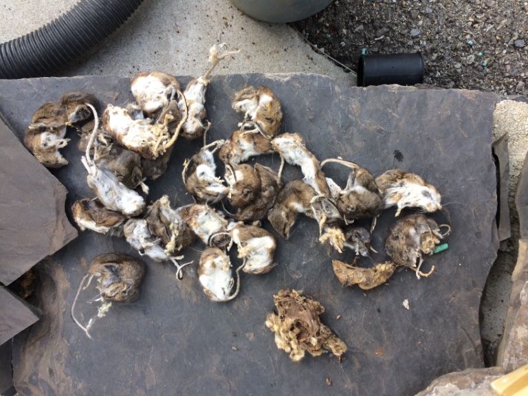 About 40 mouse corpses in the tank (along with a LOT of mouse bait and grain and upholstery fuzz)