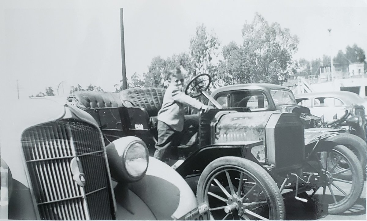 This photo is of a friend of mine who recently passed away at the age of 76 climbing up into a Model T when he was a young boy. It is indicative of how long he loved Model T fords, but he was never able to acquire one until about a year and a half ago. Unfortunately after a little more than one year cancer took him. His widow recently found this photo and would like to try to identify what any of the other cars might be. The one on the left is probably the only one that perhaps could be identified. I place the Model T as under 1917 due to the brass radiator. Any help would be greatly appreciated! [/size][/b]