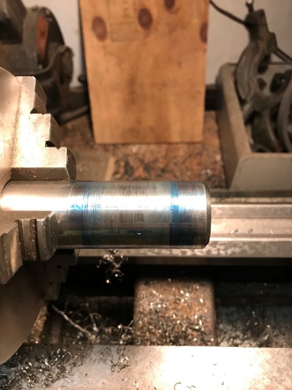 So I did what Kerry suggested. I took some 320 and then 1000 wet/dry sandpaper and wrapped around a socket to get the appropriate diameter and polished the rod. got it pretty good I think. There are a few pits left but there's enough bearing surface to be OK. I measured the crank pin and machined a shaft to that exact size for fitting purposes. With the sanding and scraping done I put some Prussian blue on the shaft and tightened it up. I think it's OK. I measured with Plastigauge and got 0.0015" clearance.