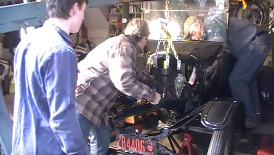 I've never done it with an Improved Car, but many times with a 1915 and a 1923. Never had any help. Radiator off, steering wheel pulled back and sitting on the seat, wishbone loosened and dropped. I have to raise the body a couple of inches on the 1915. Later cars shouldn't need that. Nose way up, tail way down, pedals clear the firewall.