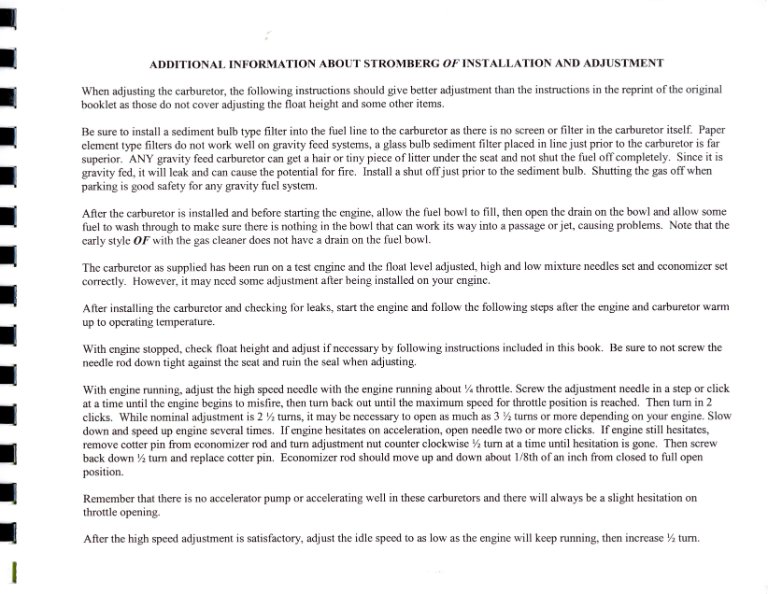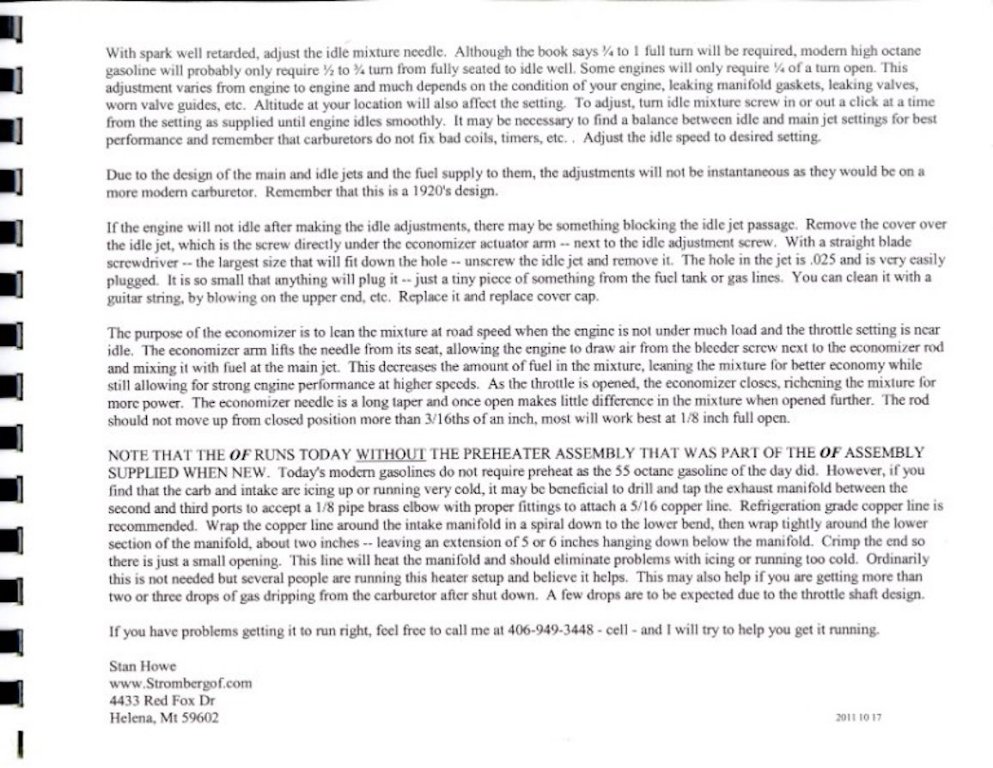 Years ago, Stan sent me a booklet that included a reprint of the original period Stromberg literature. The booklet also contained four pages of original material from Stan based on his extensive experience with this carb. Here is a copy of the original Stromberg literature from Jay Klehfoth, along with scans of the four additional pages added by Stan. Hope these help.