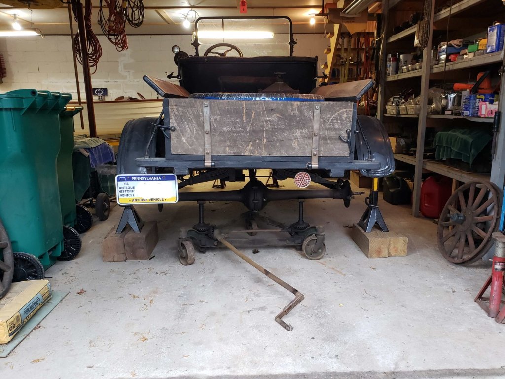 In the car!  The car is supported on my Grandfather's old digging bar made from a New Idea Manure spreader axle.  Real good steel, real heavy and perfect for supporting the back half of a T.