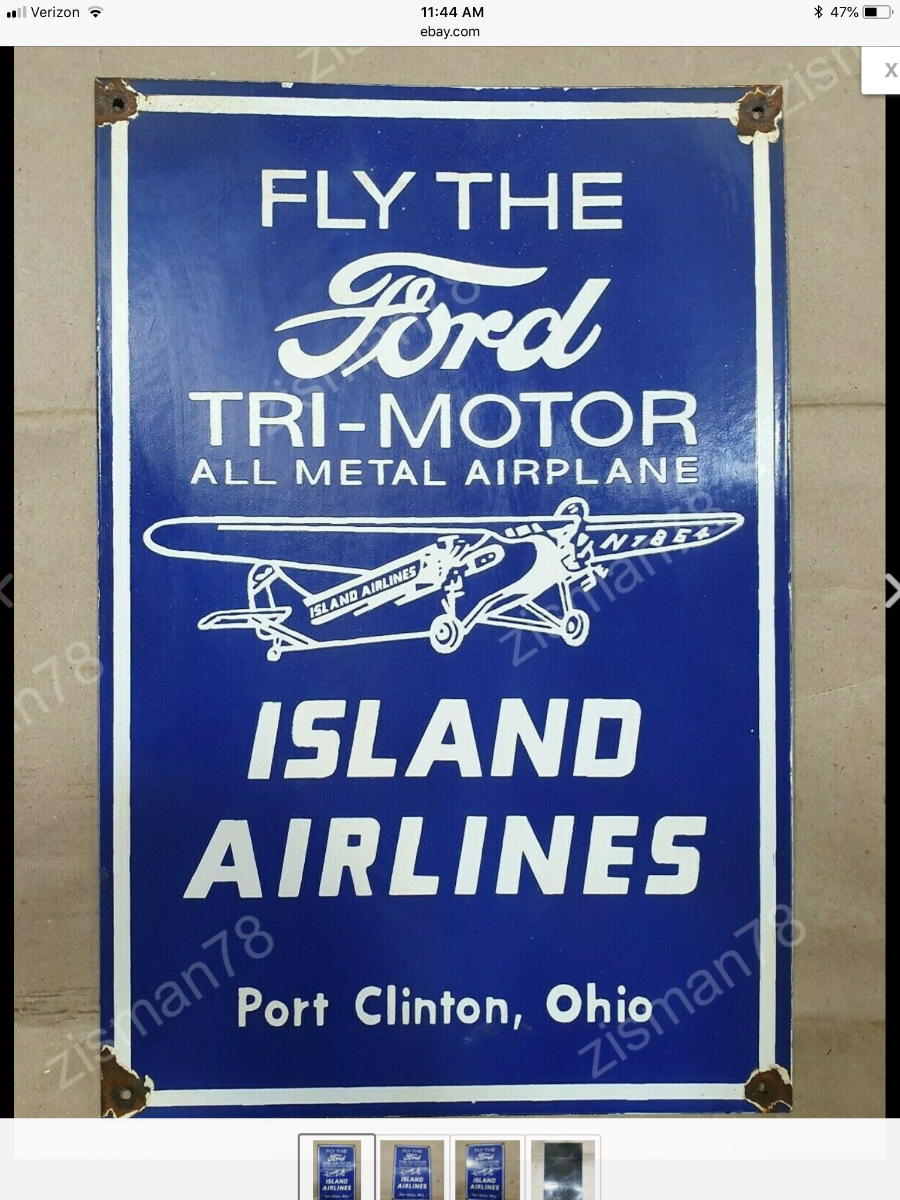 Island Airlines flew Ford Trimotors from Port Clinton Ohio to Put-in-Bay island until the mid 1980's. The signs in question may or may not be real, but the airline and the trimotor connection is real.