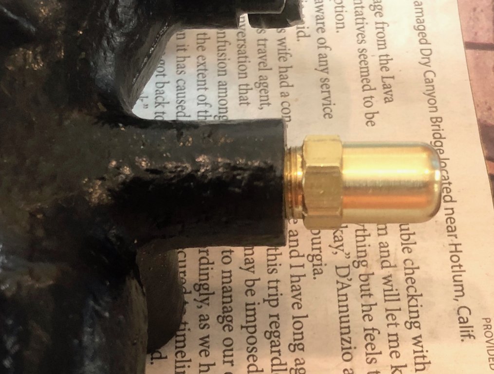 I had at the brass nut with the 1/8 NPT die and ran it down until the flair under the hex bottomed. A trial fit on the old carb showed that it was better but stiil not all the way down. Inserting the needle confirmed that we still have a problem. Just for fun, I tried the nut on the carb I'm going to use already installed in the car. The fit here was a bit worse than the one on the bench.