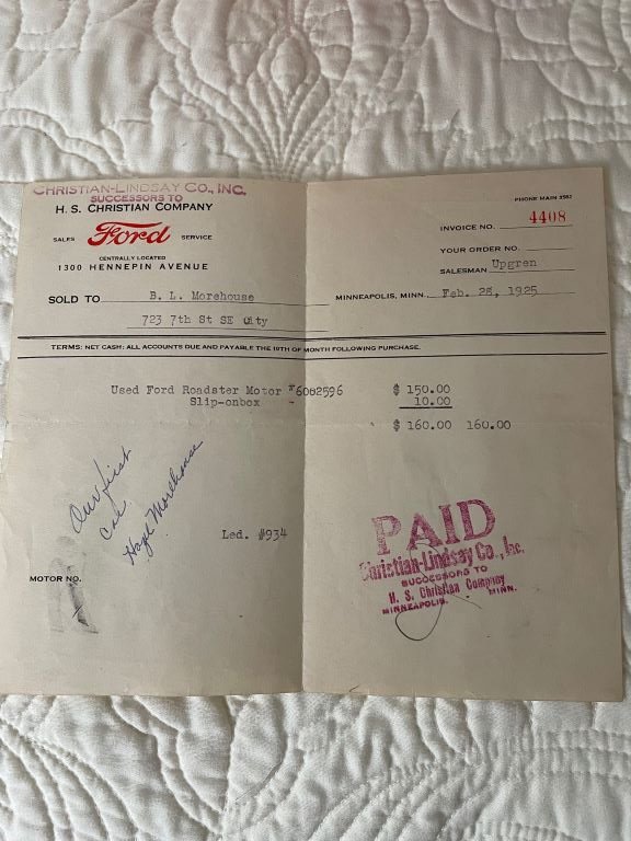 The Invoice is dated February 28, 1925 and was sold to Mr. and Mrs. B. L. Morehouse of Minneapolis. Mrs. Hazel Morehouse has penned "Our first car, Hazel Morehouse" on the Invoice with the sale being from Christian-Lindsay Co., Inc., with the same identified on the Operator's Manual.