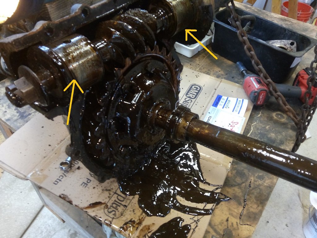 Under the gunk the hyatt bearings on the worm drive shaft were rusted and seized. It looks like water had entered the upper worm housing and sat there for some time. Cleaned and replaced with 'spares from the box' this one runs well now: