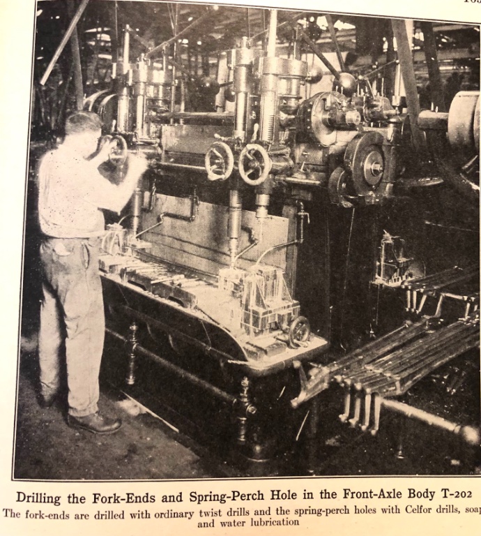 Yes, automated process to control drill hole locations on the axle for the perch and spindle holes. Tight tolerances. Holes were drilled rough then reamed to precision size. Would be very odd to have an axle drilled poorly. This is from 1915, so you know better machines were later in place.TXGOAT2 wrote: ↑Fri Sep 03, 2021 7:11 pmI'd think they'd have used some kind of gang drill arrangement. Ford invested in a lot of specialized equipment. Maybe a bit broke or spun in the chuck, and this axle was rejected and diverted to a repair station where it was hand drilled or put in a drill press, then put back on the line or sold as a replacement part.