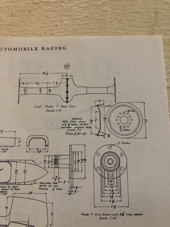 This fits in a conventional Model T rear end housing. The car has 12" tires on it, 13" removed from the width (6 1/2" from each side). Pictures and plans are in The Complete Ray Kun's Auto Racing Book. Should have taken pictures years back when we replaced the bad housings. For the like of me, cannot remember exactly the gear counts but came out to those ratios.