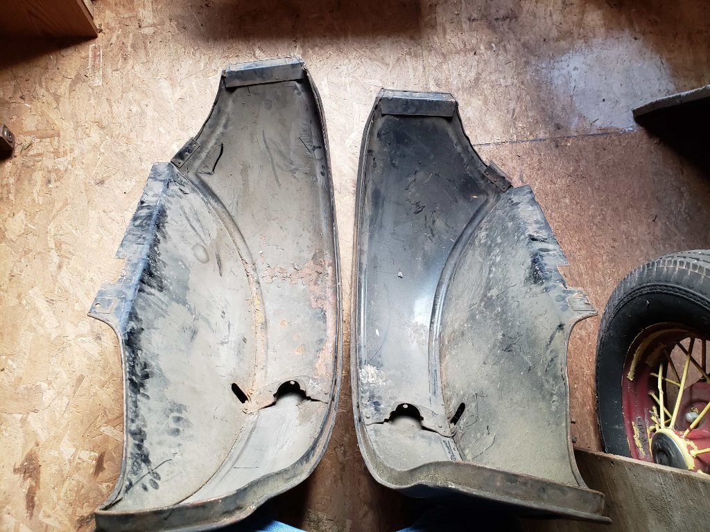 What I believe to be... A pair of 1924/25 Coupe rear Fenders. They are clean, strait, and older (original?) paint. Some surface rust, no pitting. Have not had body work done to them. Honest 'original' ford steel. Brackets are installed. Have crown to them. What you see in the photos is what I have. Check them out at Hershey and see if they are what you need!