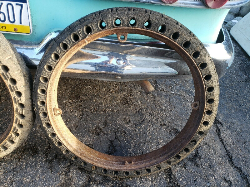 Those are nonpneumatic solid rubber tires. The holes in them are to give some cushion. Ride hard but will never get a flat. First run of TT's had solid rubber rear tires. The tires in the picture are non-ford replacement tires. Solid rubber tires use a different rim than pneumatic tires.