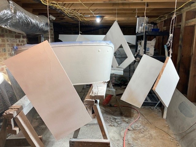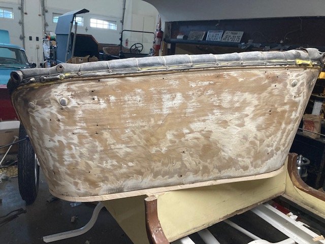 The seat looks like porcupine quills. Those are toothpicks dipped in wood glue and pushed into the old tack holes so that the new tacks will stay firm. They will be clipped off when dry then sanded down. I didn't want to wreck the 1912 body I have by modifying it as a Speedster body. It also has some delamination issues to repair and paint to strip so I am just building a new body which so far isn't too difficult.