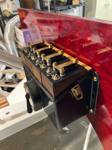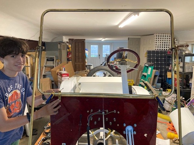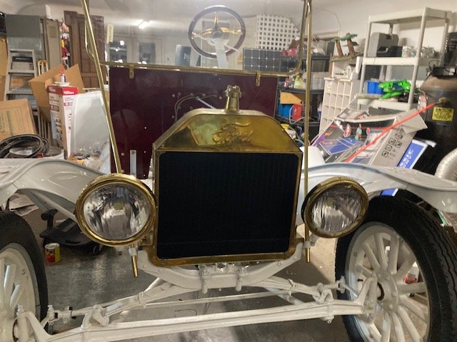 The coil box and coil boxes are in. Brass trim is on. Fitting the fenders and running board. The wood body comes back from the painter Wednesday.