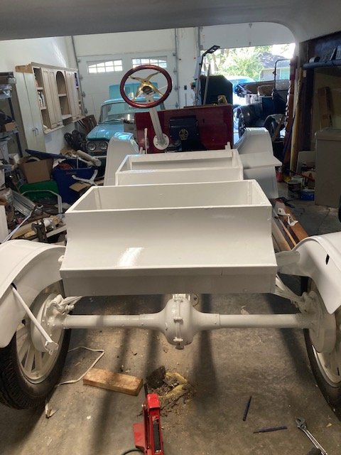 The sockets on your seat are indeed for top bows. Have a look at photos of Buicks from the 1910ish era. They used these sockets. Maybe your seat is from a Buick?ivaldes1 wrote: ↑Sun Jul 25, 2021 12:38 amShe rolls! Got past the Bimel wheel saga. Did the bearing grease ziploc bag of iniquity on the front two wheels so we now roll! Also worked on the seat. Stripped the Bondo, relminated the pieces that were coming apart. Pulled tacks and nails. Filled the holes with wood filler. I pondered the threaded sockets no doubt for a top but what plugs into the sockets and what kind of top? on the Mystery seat.