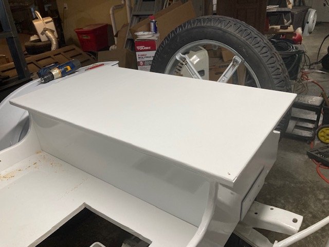 Rear deck lid is on. I used a brass piano hinge pretty much perfect size as purchased. I will put in a floor later for storage. Spring loaded eye hook will hold the front down.