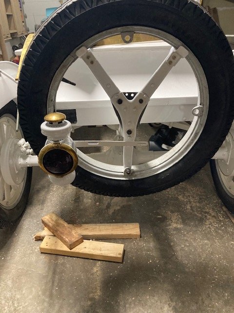 The new unfinished 21 inch wheel is here to replace the Bimel wheel that just barely did not fit. This wheel fits but I am going to have to wait to clean, strip and paint it until I get more parts to do that need finishing. I will probably put it on for now to get the chassis completely rolling. The side and rear lamps arrived in the mail and I received more small parts and fittings from Lang's. I have one side brake rod installed and working, my other side brake rod may not fit and is missing a clevis so I will have to wait for that to arrive to complete the brake rods. I found out from John Tannehill that shoes are insufficient for 26-27, that I need to buy and rivet on brake linings. Doh! Another Lang's order.