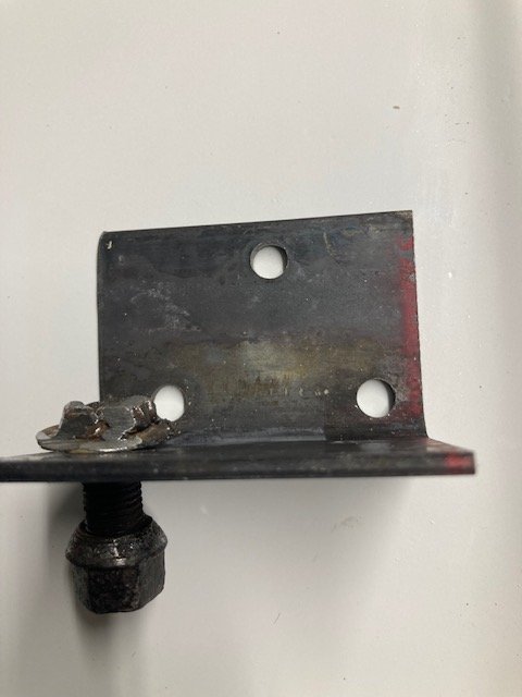 I built a bracket out of angle iron. I shortened a rim bolt for a good tight fit in the ear on the spare. Cut the bolt, put a washer on then welded all around the junction of the washer and the bolt. Then I cut a piece of angle iron and drilled it to match the holes on the license bracket. The prototype looked good enough so the paint is drying now. The bolt is lying on a cardboard box, the other carriage bolts in the background were poked through holes in the box to stand them up and not paint the threads. They have just been painted and are drying. The license holder is going to be at a bit of an angle towards the front of the car. I can put some washers on the back side of the tip side mount to make the license plate look straight.