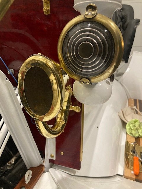 Horn is back from the music shop after polish and repair. I used a brass Hillman bushing as a connector, the music shop put a cork seal on to make it detachable and it worked well. Windshield glass is here and the frame is test fitted. Exhaust and muffler are in place. Fuel line is next.