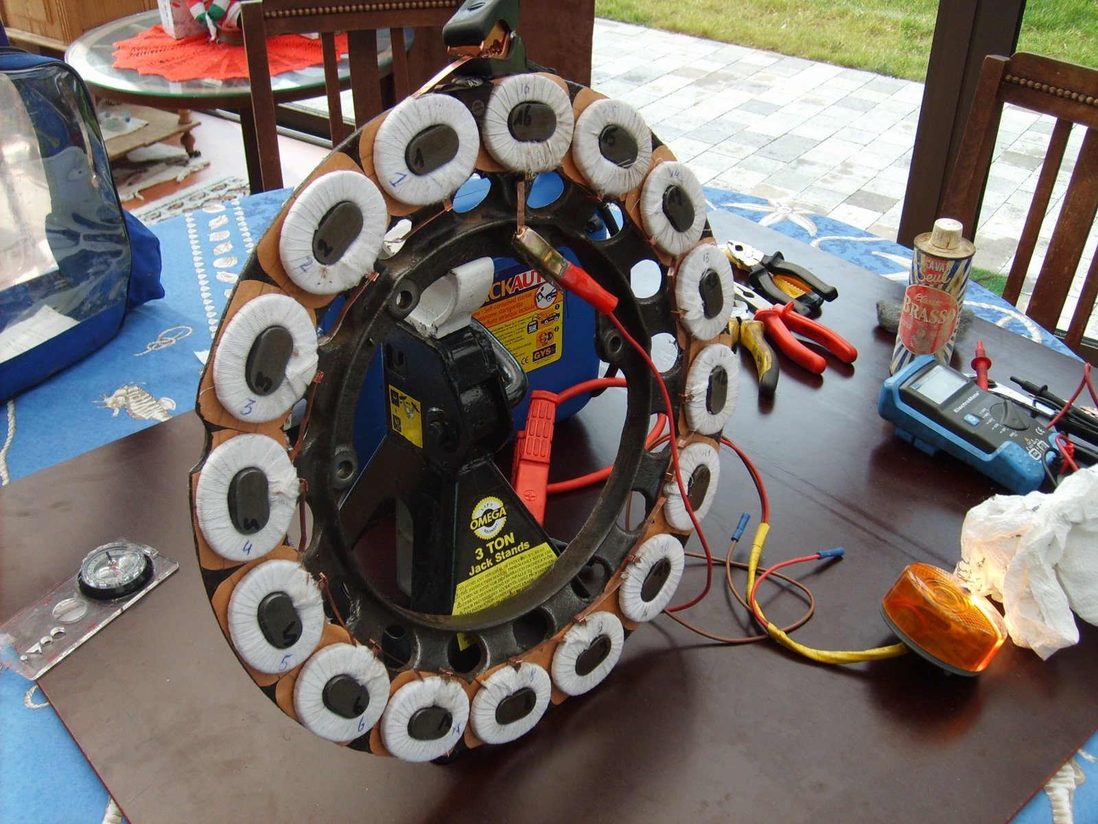 To control this make a loop with a 12V 21W light bulb, your magneto coil ring and a 12V battery. Use a compass to check the magnetisme and the change N-S.