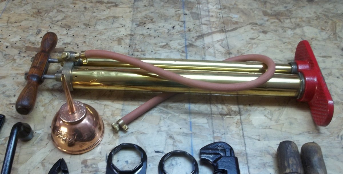 I am in the process of refinishing a two cylinder, Bridgeport Brass tire pump for my 1915 Model T. What finish should be on the top cast iron part that is on top of the two brass cylinders?