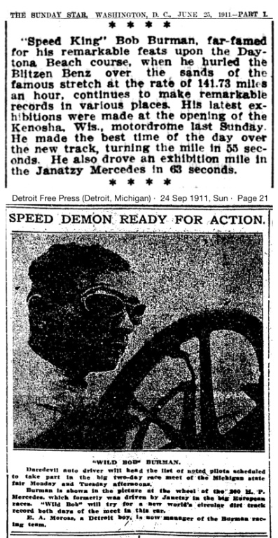 In the first article below, Bob Burman "also drove an exhibition mile in the the Janatzy-Mercedes:"