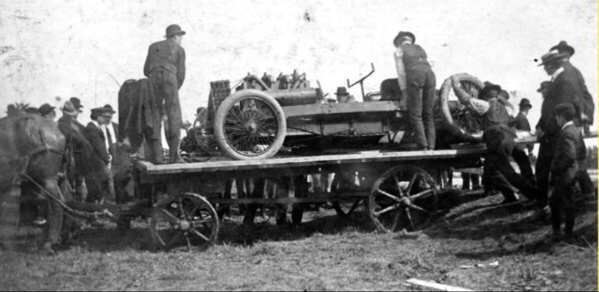 Yes, it's Arrow (999's mate) after wrecking at the Milwaukee Fairgrounds in the fall of 1903. Frank Day, driving, was inexperienced and died while racing 999 driven by Ed Huff. Tom Cooper, who owned both racers, was away at the time. Cooper sent the racer to Henry Ford in Detroit, who rebuilt the it and set the world one mile speed record in early 1904 on Lake St. Clair. Another pic of the wrecked racer as it's being loaded: