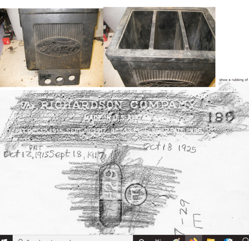 The battery box Russ posted is 100% correct, but the lid was actually used in 1925 too. Before that, they had rounded corners. I have no information on when Ford introduced the style we now use, but the earliest ones are different. I've sold probably a dozen exact copies of the original bottom box. If I could get orders for at least a dozen, I would be able to have another run made. What Don mentioned above is correct too.