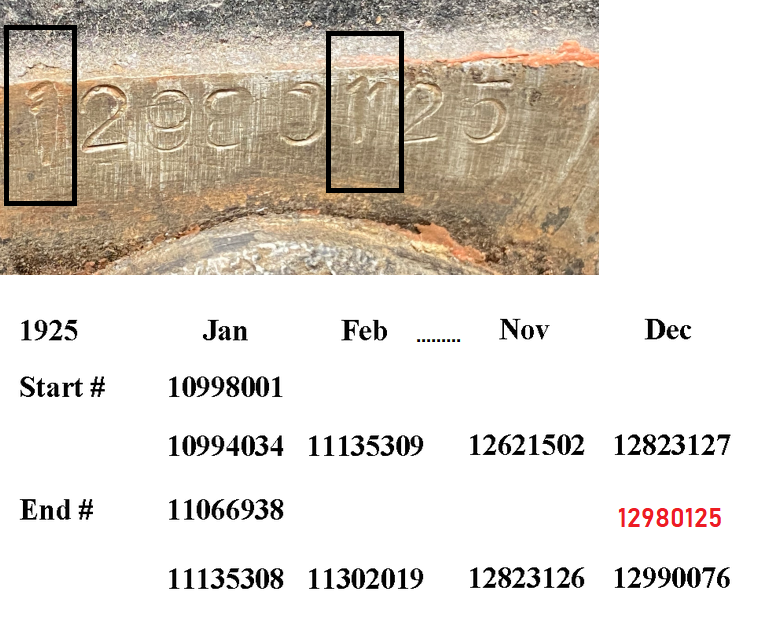 Looks like a dull #1 bouncing on a second strike. I'd say the number is 12980125 without question. A single cylinder valve cover is from 1921-27 and can also be used to confirm the date. The hand written Bill of Sale shows a different 1924 number 12893609