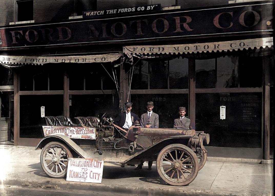 1908 Ford 6-40 Model K Roadster configured as a tourabout. This car raced a Stoddard Dayton from Oklahoma City to Kansas City, winning by a few hours. A Wichita KS to K.C. MO record was also made. Here the car is seen at the Ford Branch Store in Kansas City after the run: