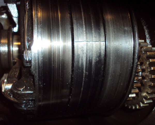 ... disassembly revealed two cracks in the low speed drum. I suspect it cracked from the incident but it could have happened anytime in the last 20 years. The 3 drums and bands were blued from heat much worse than parts away from the friction heat. The engine oil was black as ink and 1 1/2 quarts had disappeared. It also contained a grit like sand. This was burnt or worn from the Kevlar. While the pan is off the engine I have thoroughly cleaned both the pan and engine. The reverse drum bushing was frozen to the slow speed drum shaft. I had to heat it to remove it and when it cooled it was too small to fit back in it's hole tightly FWIW. All the other parts looked good enough to reassemble with a good low drum and new bands. I couldn't see excessive wear from the incident except for the bands.