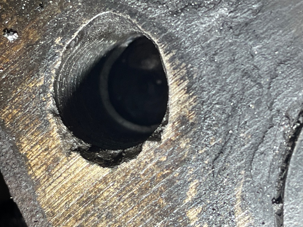 The photo below is AFTER I cleaned up the hole with a 29/64 bit, using the head as a drill guide. There’s very little cleanup, except that what little bit of thread that previously allowed the bolt to snug up is gone. There is still noticeable wobble of the 29/32 bit in the hole with the head off, so I’m not going to chance the Helicoil brand and go with EZ Lok.