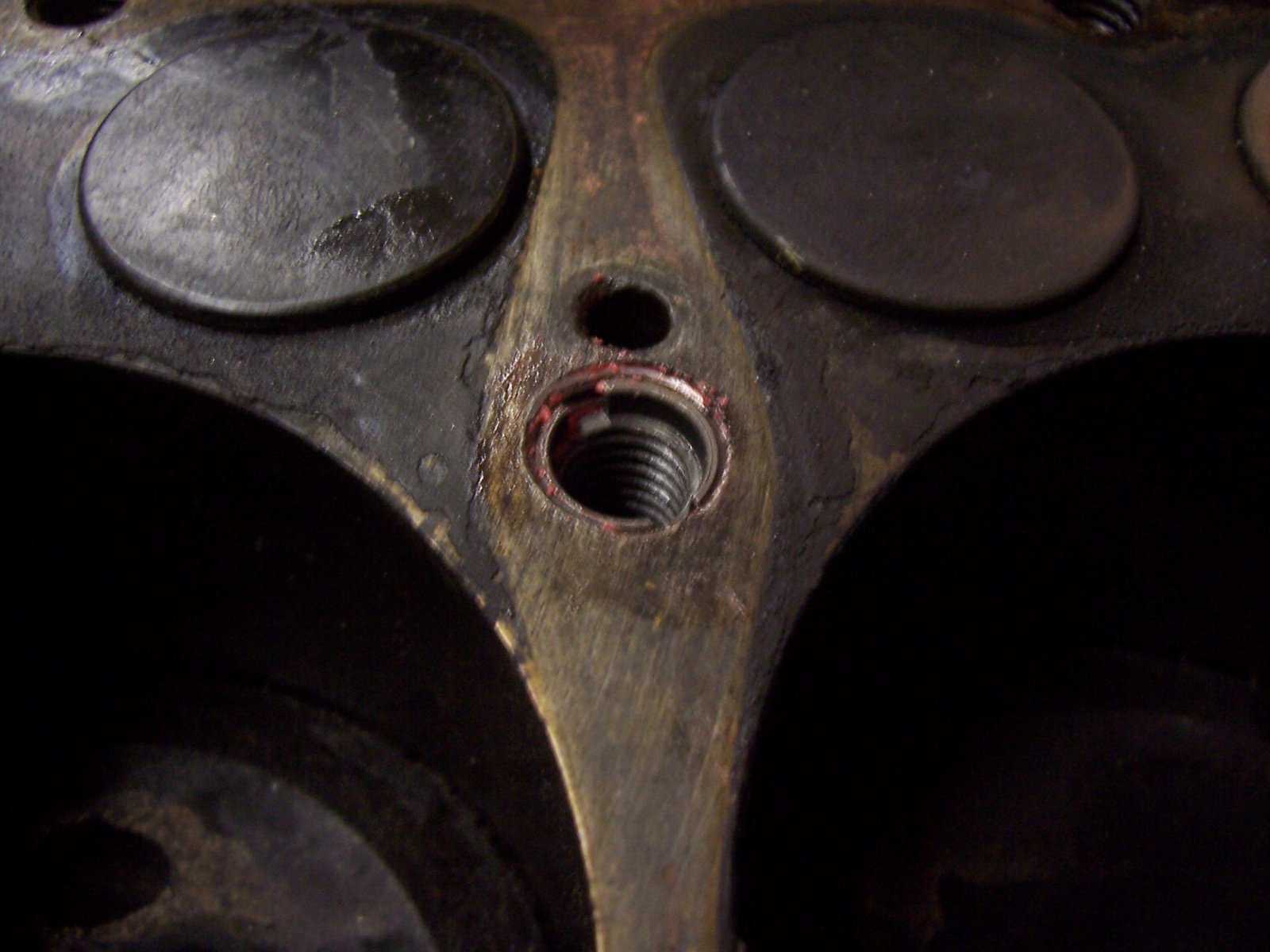 The photo below is AFTER I cleaned up the hole with a 29/64 bit, using the head as a drill guide. There’s very little cleanup, except that what little bit of thread that previously allowed the bolt to snug up is gone. There is still noticeable wobble of the 29/32 bit in the hole with the head off, so I’m not going to chance the Helicoil brand and go with EZ Lok.