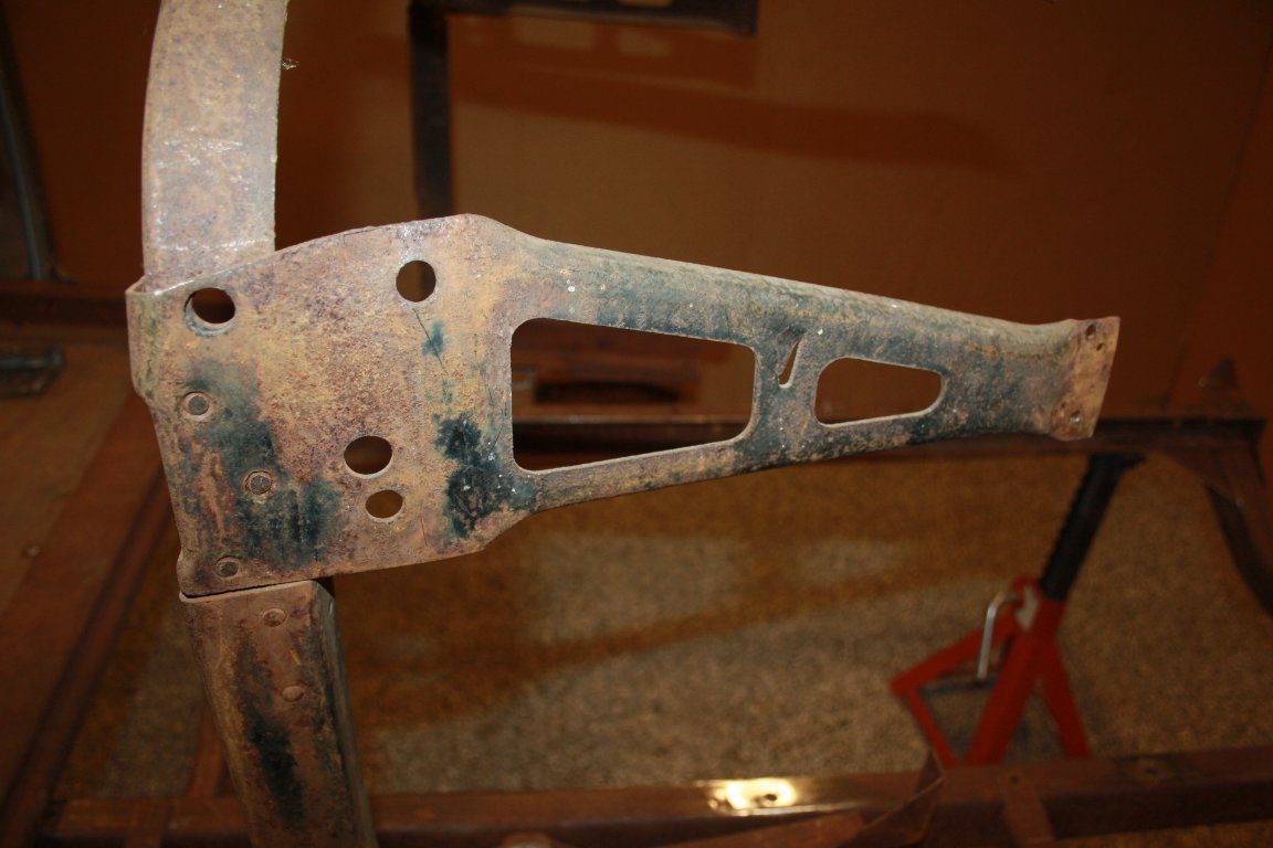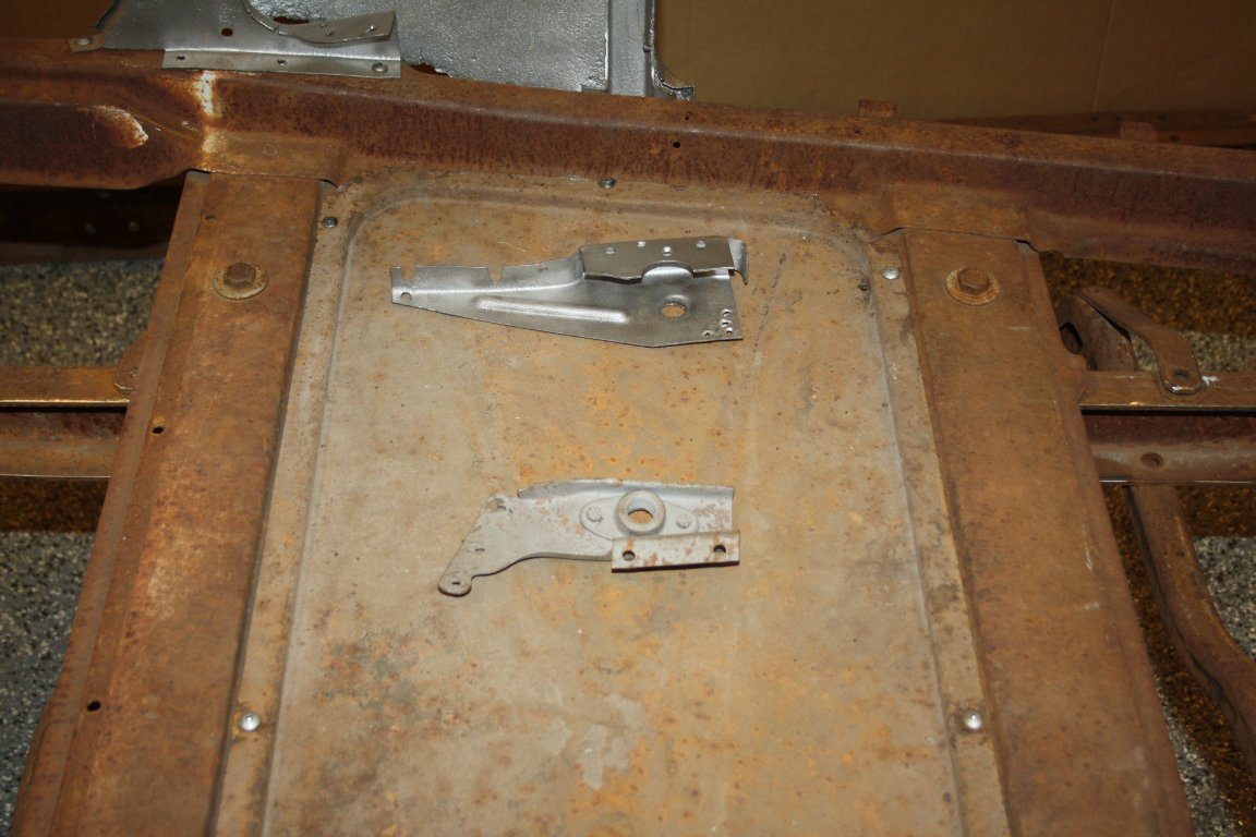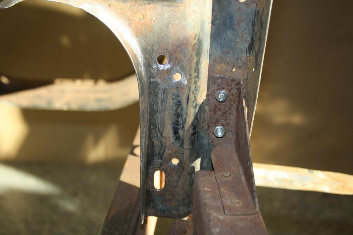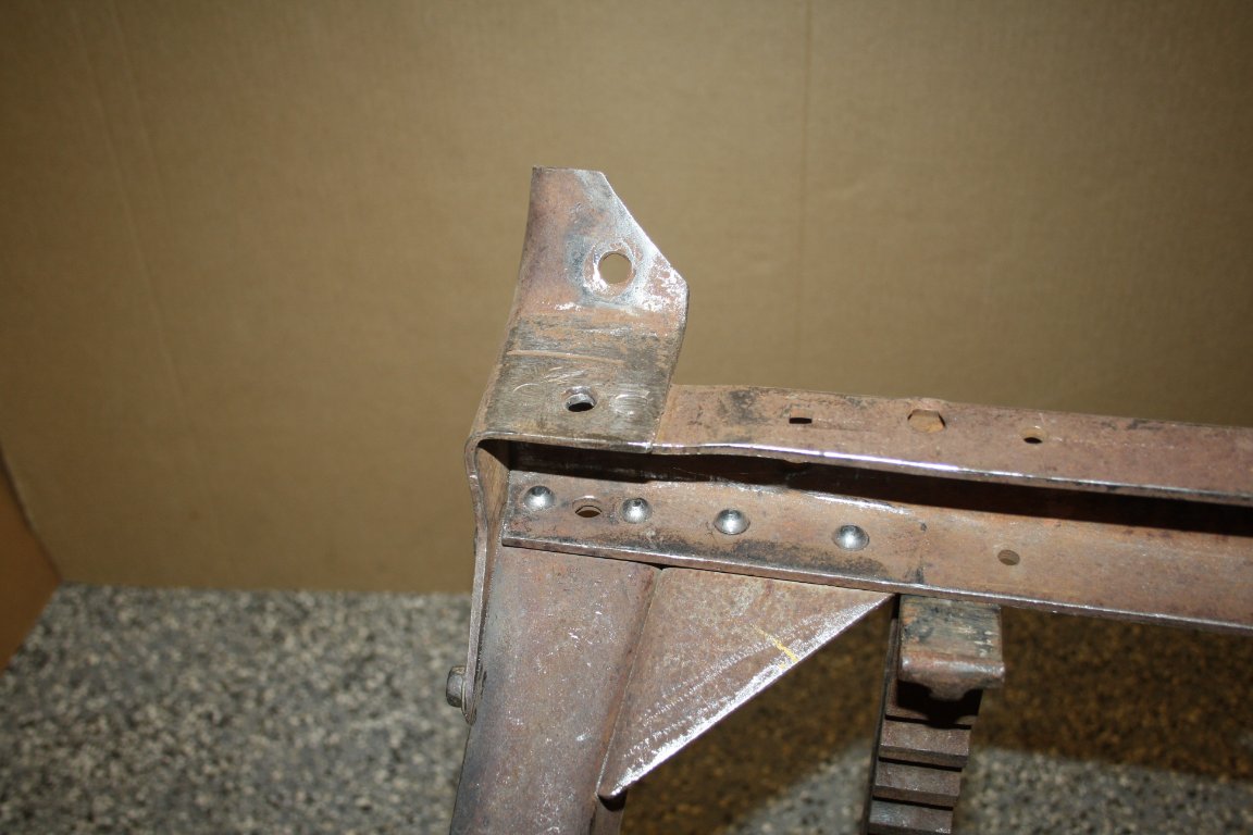I will start with the frame. I set it up to be level and square. I discovered that it had been bumped in the right front corner and was out of square. I removed the distorted rivets because they were no longer a tight fit. I straightened and refit the bracket #2860B, and replaced the rivets with temporary bolts. Next was to push the frame to a relaxed square fit, and then tighten the temporary bolts. I then replaced the bolts with rivets one at a time.