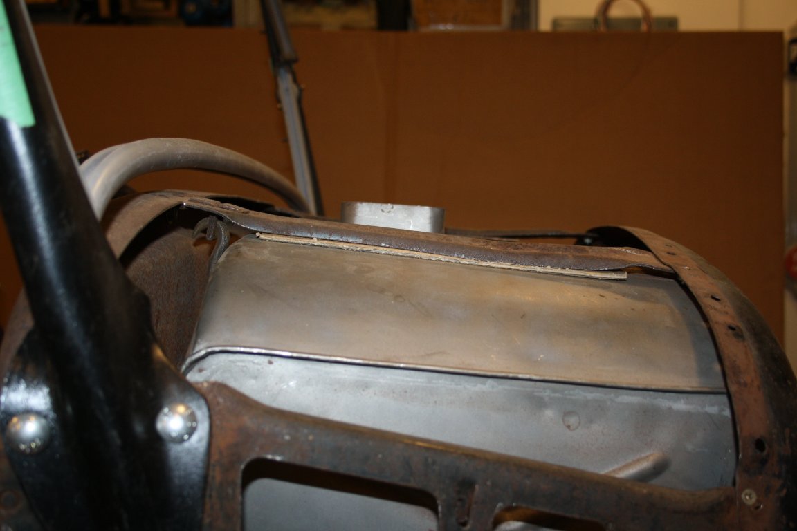 #30- With the cowl structure exposed, you can access the upper braces if they have sagged or have been dented down. The tank strap hanger brackets bend forward with tension from tightening and the car bouncing. Bend the tank strap brackets slightly rearward so that the straps can be installed with the tank in place. You now have access to the split rivets that hold the webbing above the tank and you can hold the tank in place with one hand while tightening the straps with the other. Fitting the forward tank pad/cardboard is a breeze.