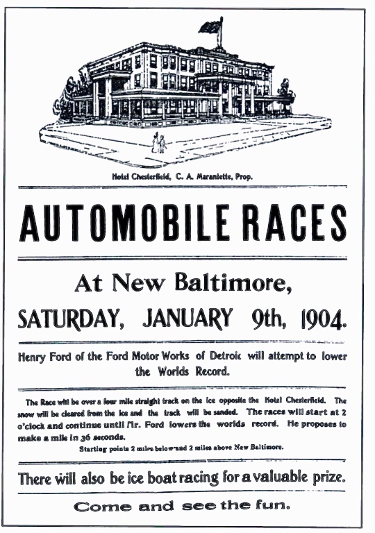 Ford enthusiasts aren't strangers to Lake St. Clair, where Henry Ford set the world mile straightaway record in early 1904. Below, the attempt was announced prior to the event. "There will also be ice boat racing for a valuable prize."