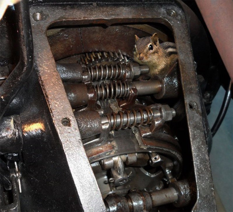 On one of Dick's excursions he found and sciuridae badly beaten by renegade parakeets. He nursed the little fellow back to health and they became fast friends. Chippley, as he became known, liked to hide in the Raceabout transmission but the oil became rather disgusting. With a little training Dick found that if he drained the oil out and flushed it with some Happy Sally his new friend could weave kite string into the bands and thereby avoid the need for replacing them. Regular string was not sufficient. Tweezers made the job go quickly. One Summer the two did 63 transmissions for friends and relatives. They planned to do more but an unexpected free start turned Chippley into dog meat. Hennessy did manage to take this photo before the mishap. Dick searched for a successor but was never able to replace him.