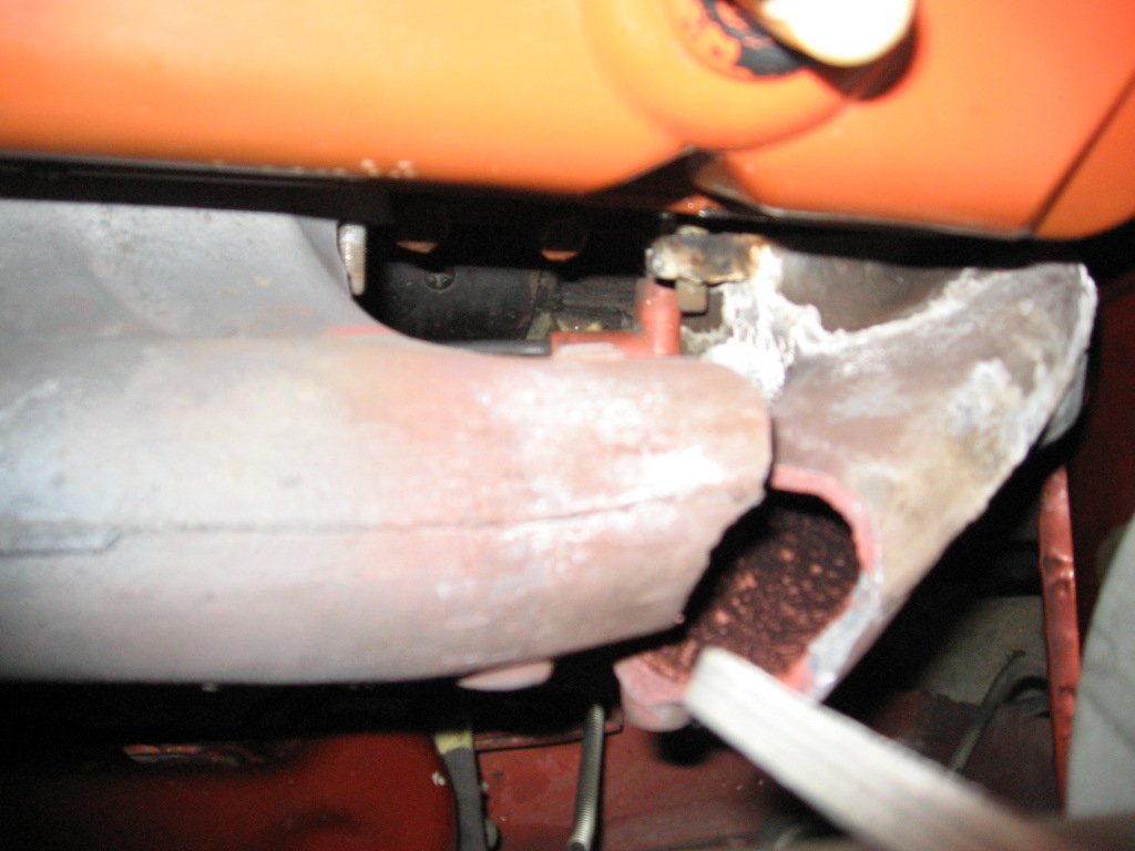 This horrible (choose preferred expletives and similes here) did TWO things that made short term failure a certainty! One, because the output was significantly angled, one side of the motor exhaust flowed nicely on out to the muffler and tail pipe. The other side, had to fight its way doubling back and pushing against the other side with a dominant flow. So slightly more than half the crossover pipe had one side that pressurized hot gasses and held them causing the manifold and crossover pipe to heat up way more than normal. And then two, because the shallow "U" shaped pipe went straight under the oil pan, the two two inch pipe formed bends with only a few inches of rise on each end had virtually NO NADA NONE flex. The overly heated crossover pipe, at about a thousand degrees more Fahrenheit than the crankcase, expanded more than the block did. Once the manifold bubbled and cracked like yours did, it didn't take much differential in thermal expansion to snap the manifold into several pieces.